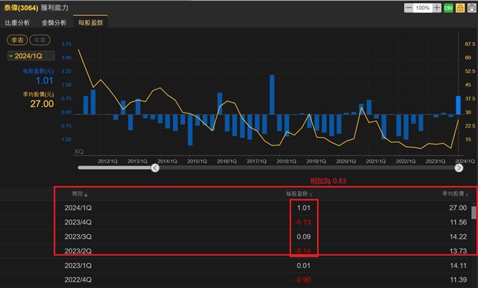選股中心出來的數字是-0.27,易點靈的資料,過去4個季度相加是 0.83,這2個數字對不起來。應該是選股中心這邊的資料錯誤機率比較大。