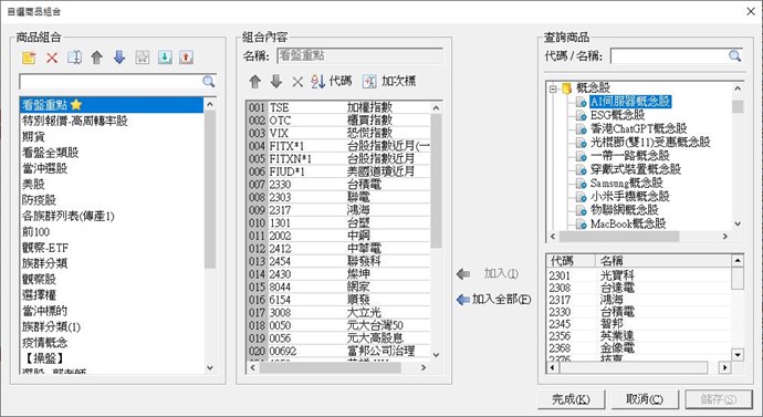在編輯自選商品組合有「概念股」商品可以選擇。