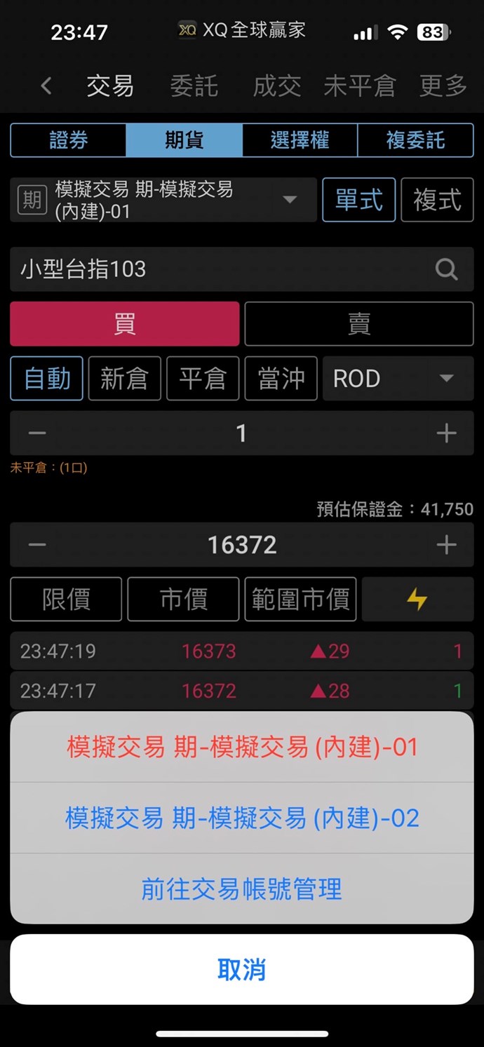 您好,若是使用券商帳號登入,只能進行實單交易,沒有模擬交易功能(也無法增加其他券商下單帳號)。