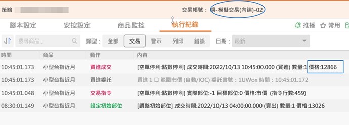 我有一個模擬帳號2在跑自動交易,原本是空單,今早有停利發生平倉的訊號而自動平倉,而自動平倉是買進一口市價,成交價是12866,的確順利平倉沒錯,但這個平倉的下多單竟同時下到我另一個日盛期貨去,造成我日盛期貨無名多一口多單,嚇到後就趕快手動平掉。