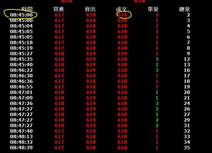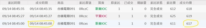 台積電期091是在08:51:00才有第一筆成交在617,但為什麼在模擬帳號08:45:00會成交在617呢? (如下圖)