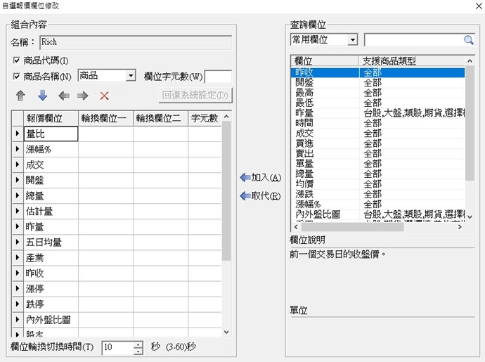 想建議一下,可否在欄位部分,新增自訂欄位呢? 意思是可以用XS語法寫的的欄位,例如選股中的那種,感恩