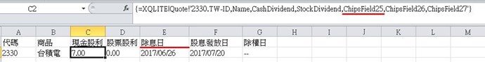 要下載台積電的股價資訊,欄位為:商品代碼、成交價、開盤價、最高價、最低價、總量、除息日期,此時要在excel的儲存格內輸入: