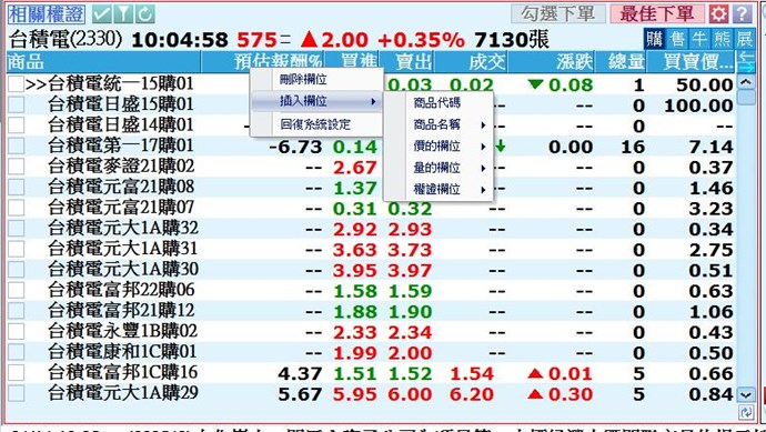 您好,權證看盤頁面下方相關權證,可以在欄位區按"右鍵"增刪欄位。