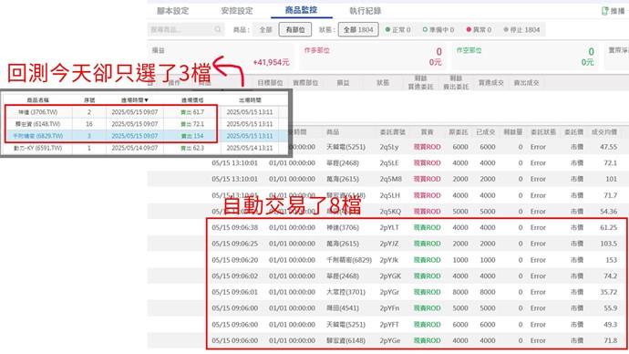 回測與實戰一般都會有些差異,你先試著檢查看看,那5檔不該進場的商品,是否符合進場的條件。若符合,再思考看看,回測的邏輯是否沒符合。畢竟回測是靜態的,而實戰是動態的,兩者會有些許不同。