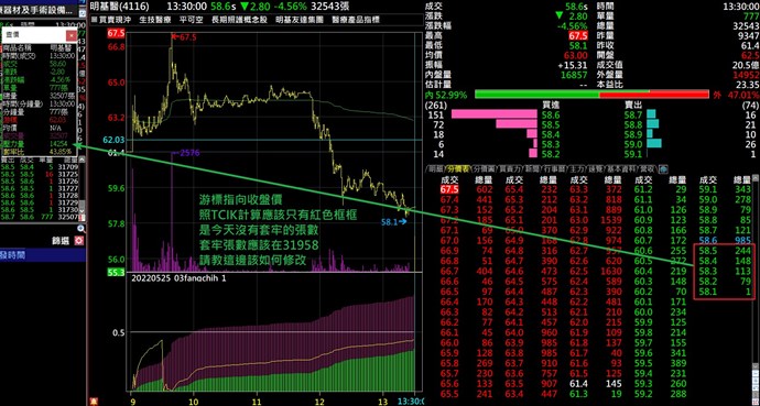一開始是使用當天均價線去修改~~沒有使用TICK對成交量還是怪怪~~所以我想要請教TICK檔的寫法