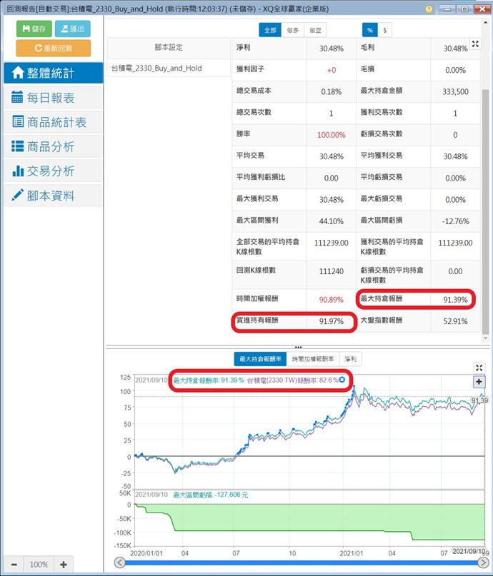 為什麼會提這個的原因是因為,如果要拿波段策略跟買入持有策略比較時,用最大持倉報酬率比較,永遠贏不了買入持有策略。