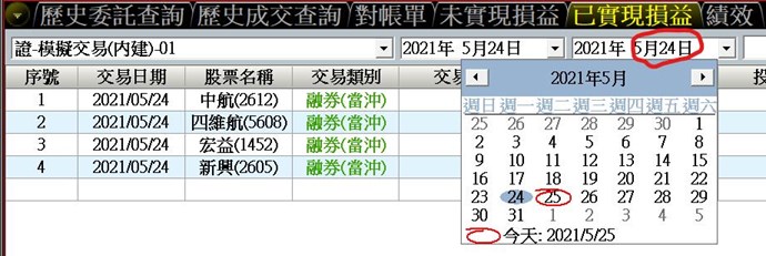 如圖:今天是2021/05/25,可是在已實現損益中,我卻無法將日期設定為2021/05/25,只能設定為2021/05/24。