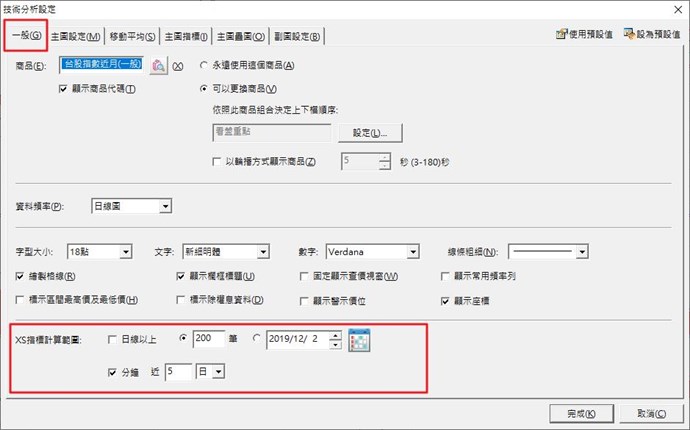您好,請在技術分析按右鍵→設定的【一般】標籤,並查看「XS指標計算範圍」是否有設定到較短的日數,可以自行調整為所需範圍即可。