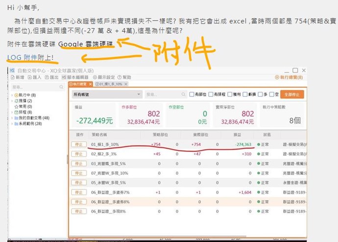 為什麼自動交易中心&證卷帳戶未實現損失不一樣呢? 我有把它會出成 excel ,當時兩個都是 754(策略&實際部位),但損益兩邊不同(-27 萬 & + 4萬),這是為什麼呢?