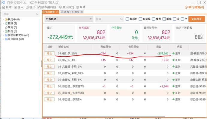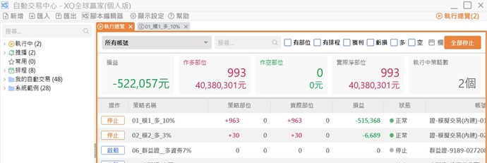 另外需注意,自動交易策略的損益會包含策略啟動後庫存進場出場的已實現損益,但XQ的未實現損益只會有還未出場商品的未實現損益。