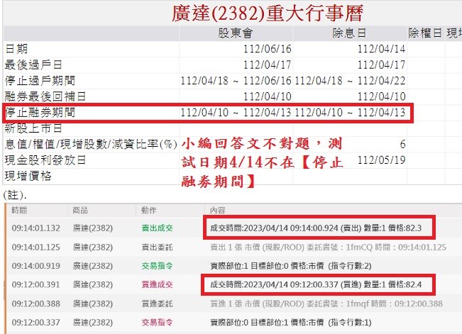 小編回答文不對題,測試日期4/14不在【停止融劵期間】
