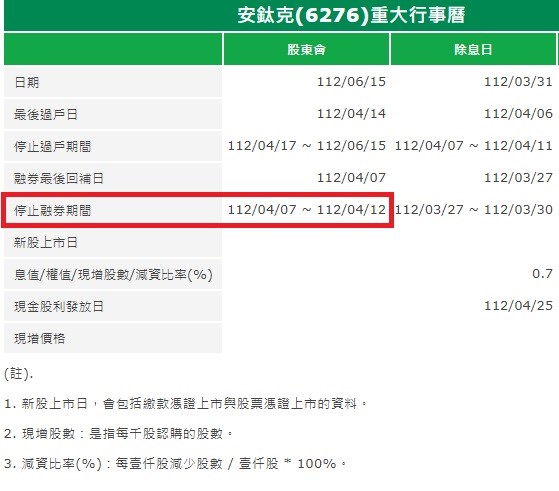 安鈦克(6276)停止融券期間 112/04/07 ~ 112/04/12