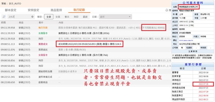 只要該日禁止現股先賣、或劵賣者,常常發生問題,也就是自動交易也會禁止現賣平倉