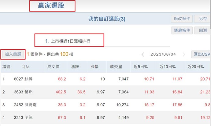 建議可以使用「策略/贏家選股」功能(需要有台股進階模組權限[每月300元]),例如“強勢股”依以下條件查詢後可以加入自選。