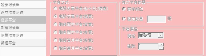 此帳號只做單一策略空單進出場,現股平倉有點選"庫存部位",但在無庫存狀態下還是會送出多單委託單,請自己瞧瞧。