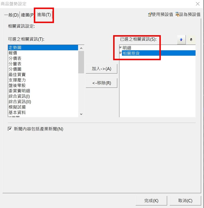 先設定其中一邊的商品盤勢設定,「進階」這部分加入明細和「相關期貨」