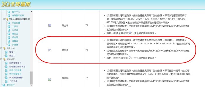 您好,XQ使用說明可以在程式內按【F1】取得,可以參考「分析工具列」中“甘氏角”的相關說明。