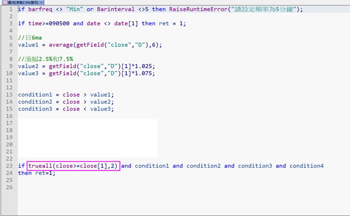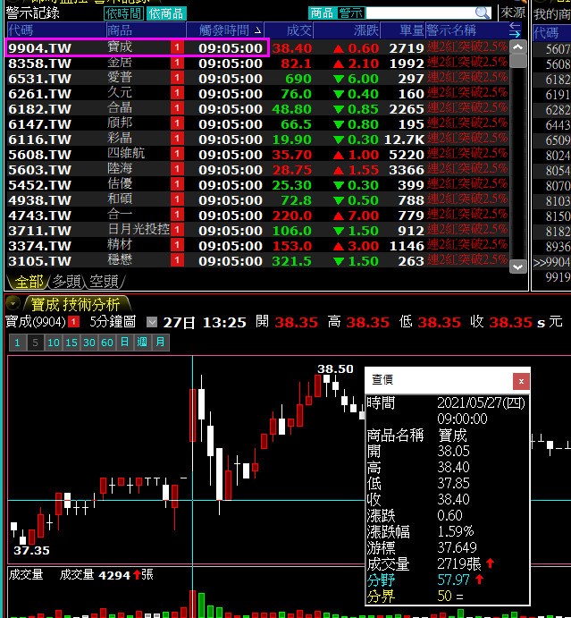 我設計了一個腳本如圖紅框-->5分K連2紅,只是這兩天測試下來9:05就觸發,表示包含了前一日的那根5分,
