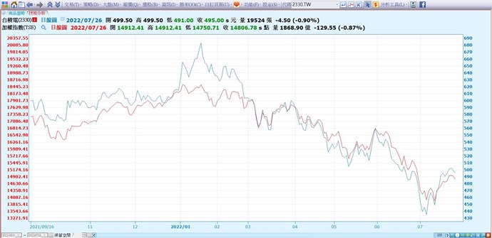 另外若是在技術分析,可使用雙座標圖(右鍵/設定/主圖設定/雙座標比較),可以設定加權指數與商品比較。