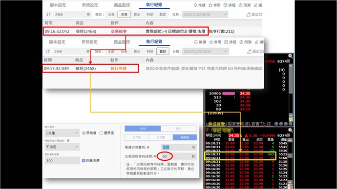 後來把「交易回報等待時間」改成 60 秒 (目前系統最長也只能設 60 秒),就變成在價格穩定的第 60 秒出現『沒有收到委託成功回報』的錯誤訊息。