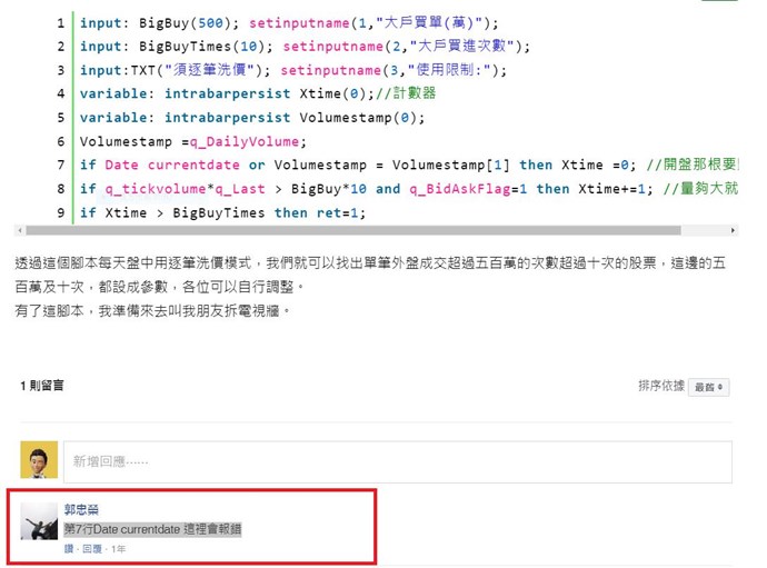 if q_tickvolume*q_Last > BigBuy*10 and q_BidAskFlag= -1 then Xtime+=1; //量夠大就加1次