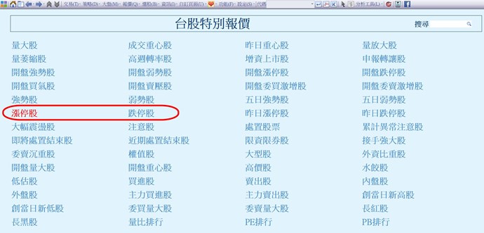 您好,在特別報價功能【報價→台股精選報價→上市櫃特別報價】,有「漲停股」和「跌停股」項目可以選擇。