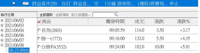 以6/8今日為例,雷達警示出現長榮2603但執行商品內並無此商品,選股中心也無此商品,盤後晚上回測也無此商品
