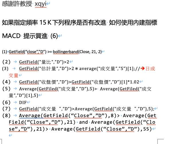請教盤中量化自動交易腳本,如何自選股中 執行15K 符合下列條件觸發警示或自動下單