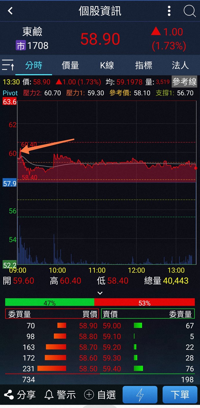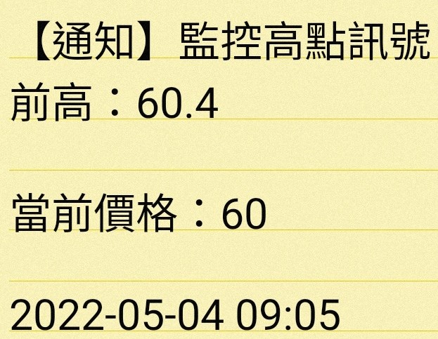 if value2 > 4 and trueall(value1 > high and close < close[1], value2 - 1) and time < 100000 then ret = 1; //如果連續N根(最少要3根)Bar的高都沒有超過value1,收盤價持續向下且在10點以前的話警示