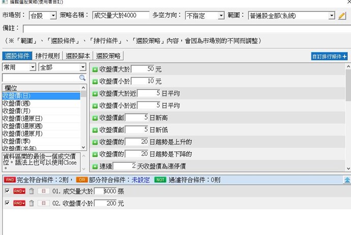 我語法很簡單 今日收盤 我去搜尋我希望當日成交量有>=4000張 然後當日收盤價<200