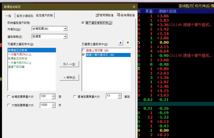 您好,目前「台股即時選股」功能無法自訂增加條件,以下提供XQ選股相關的功能,可以參考看看: