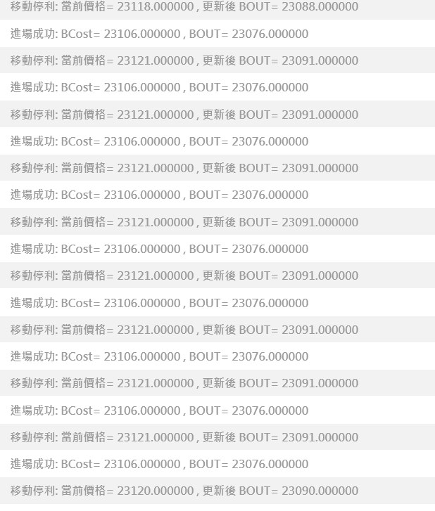 請問各位大大們,關於移動停利的疑問,我有列印資料看 更新後 BOUT 理論上應該 只會向上移動,但卻是會變動,應該在移動在獲利點上 出場卻沒有 一直獲利不出場 ,有時出場不是更新後 BOUT 而是原始的BOUT價,求助大大們幫忙^,^