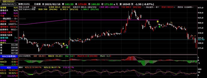 策略是希望 DIF由負轉正那根為關鍵K(黃色箭頭),之後股價收盤突破那根關鍵K的高點買進(黃色B)