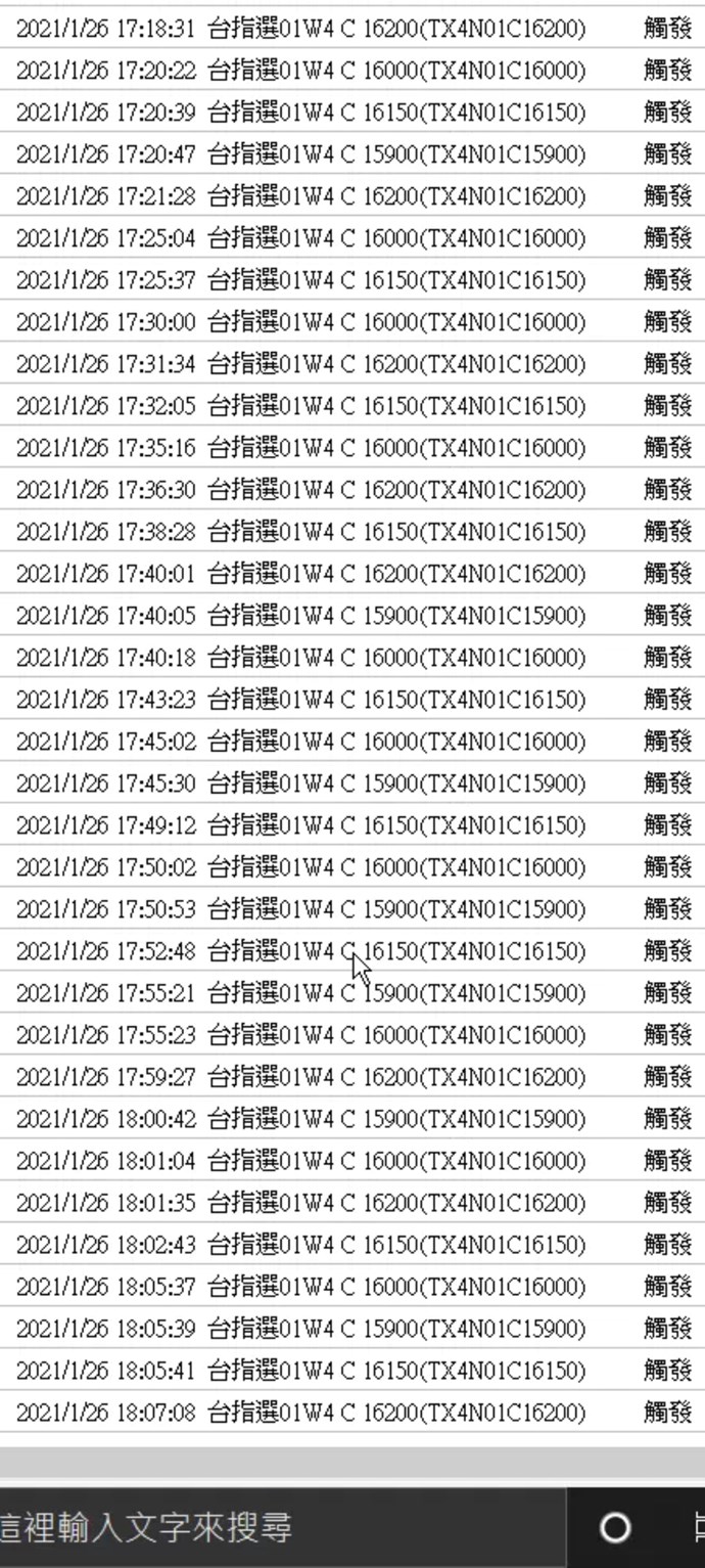您可以研究一下我上傳的策略記錄圖,15900在一個小時內每隔5分鐘都會觸發但是15950在一個小時內通通沒出觸發,再來16000在一個小時內每5分鐘都有觸發,周選擇權上下檔位在一個小時內都有觸發而中間檔位卻一個小時內都沒觸發,這不符合常理,中間檔位指的就是15950,再說實驗結果是三個中間檔位一個小時內都沒觸發,這更不符合常理。