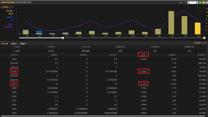 台驊投控 2021 年 2022 年的殖利率都超過9%。