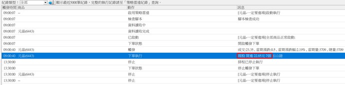今天6443元晶漲停,看到時非常興奮,以為賺到一根長紅棒,但後來才發現,策略雷達觸發後下的委託單因為價格不對,沒有成交(依照設定委託價位是觸發價往上三檔(23.5),但策略雷達卻送出22.85的委託單),有勞小幫手協助處理,看看問題出在什麼地方,如果再多發生幾次,真的會吐血.....