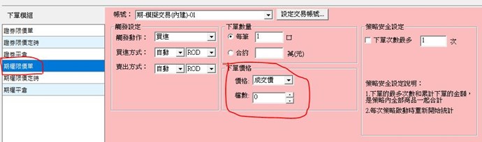 問題1、在策略雷達->下單設定->選 期權限價單-> 找到下單價格, 價格選"成交價",檔數隨便調,-> 按儲存,檔數會自動跳回0