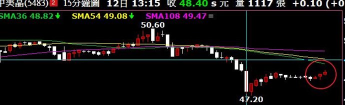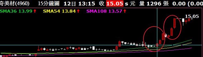 實際15分K棒 觀察中美晶只有收盤有連續三根 奇美材有兩次出現 但不是出現在最後一盤