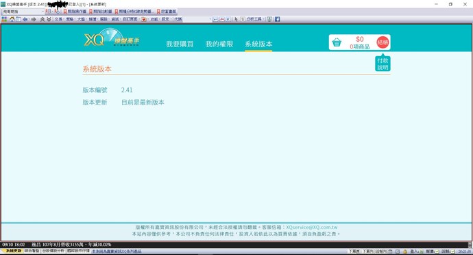 請問您XQ操盤高手系統的左上角版號是 2.41 20180903 嗎?若是其他,請您提供一下您的版號,以利小幫手查看問題的原因,謝謝。