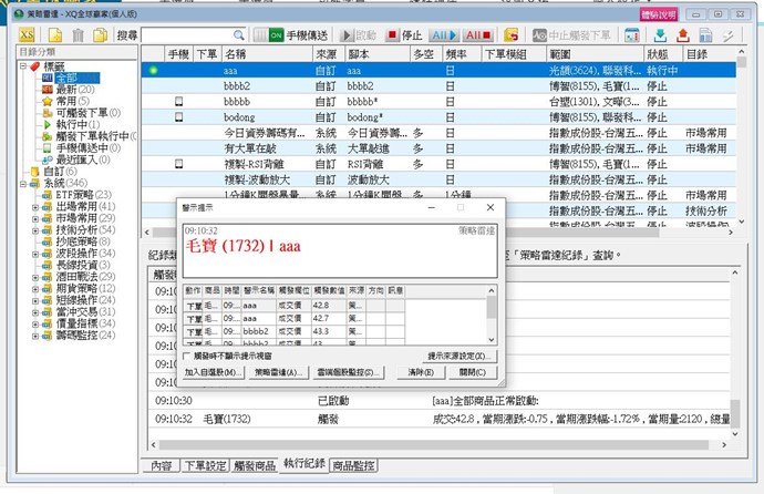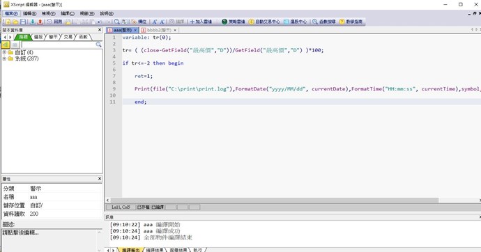 Print(file("C:\print\print.log"),"開盤爆量",FormatDate("yyyy/MM/dd", currentDate),FormatTime("HH:mm:ss", currentTime),symbol,symbolName,"價格",numToStr(,close,2));