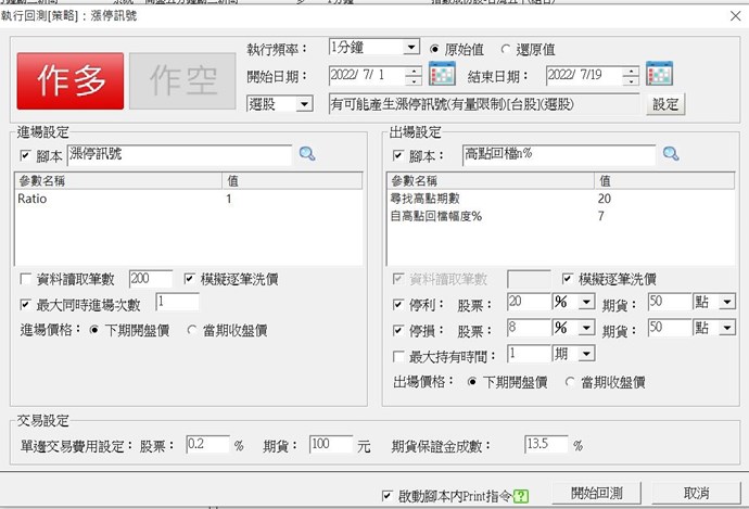 在使用策略雷達裡的回測時, 進場我使用的是1分k, 選股也是自己寫的 是日k架構(如圖)