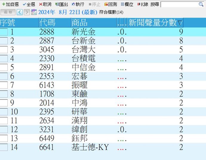 圖2 用選股中心篩選出當日有新聞的標的 8/22晚上只篩出14檔 顯然漏掉了很多
