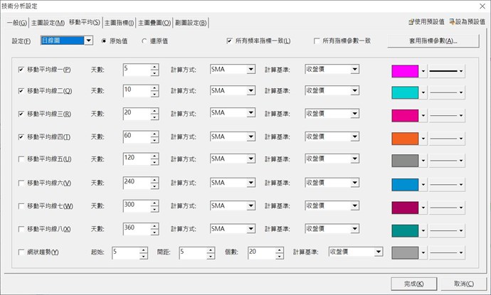 想請教是否可以統一設定所有頁面中的各個均線的顏色?
