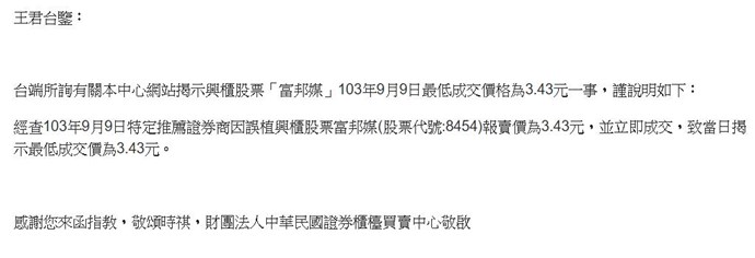 您好,有關興櫃股票「富邦媒」價格,經詢問櫃買中心回覆如下: