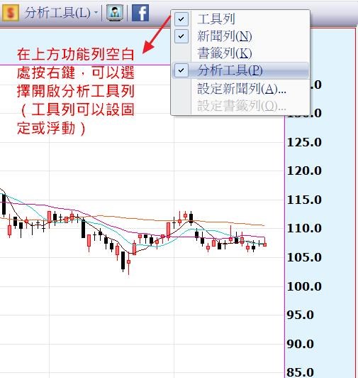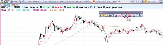 可以試試看在技術分析開啟「分析工具」工具列(工具列可以設固定或浮動),並使用線段功能。