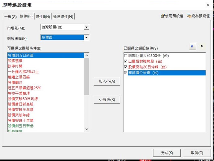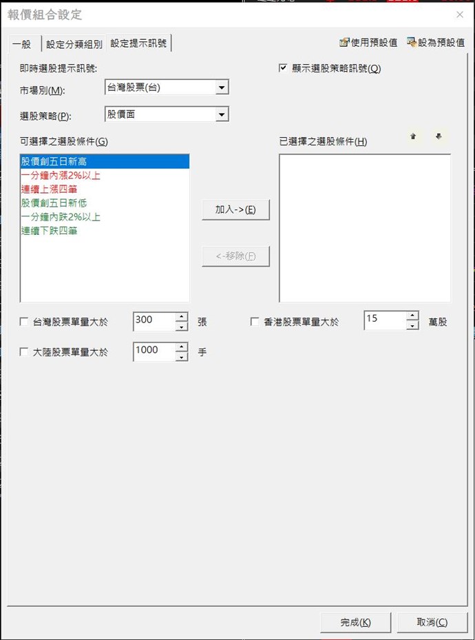 即時選股不能選台股特別報價,但是報價組合裡可以加入這些選項,這樣可以稍微解決動態清單的問題,至少能在報價組合的訊息欄裡提示