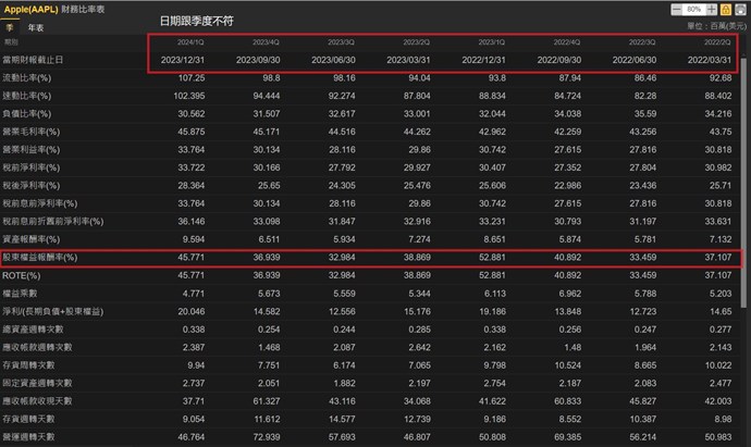 如圖 選股中心 出來的 股東權益報酬率的資料 Apple 是 156.08 非常高,再來看 一點易點靈裡面的 Apple 股東權益報酬率資料