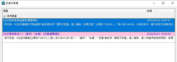 您好,即日起,XQ全球贏家的"群益證券"會全面啟用「雙因子認證」登入機制,如果您是「企業版 7.06.06」/「個人版3.06.06」以前的版本,請升級至XQ最新版本(或至官網下載安裝),並在完成升級後重新加入「群益」帳號。為避免影響您看盤交易,請先確認您的憑證是否有效,如果對於憑證有任何疑問,可以洽詢您帳號所屬的分公司及營業員。