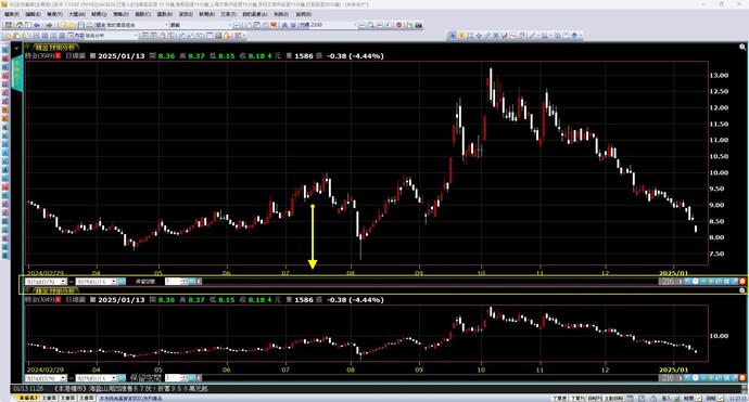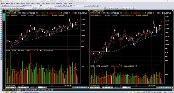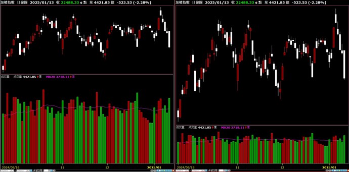 (4)可以自訂技術分析分框的高度,假設垂直分割,畫面變得細長,K棒及成交量也變得細長,希望可以自訂高度